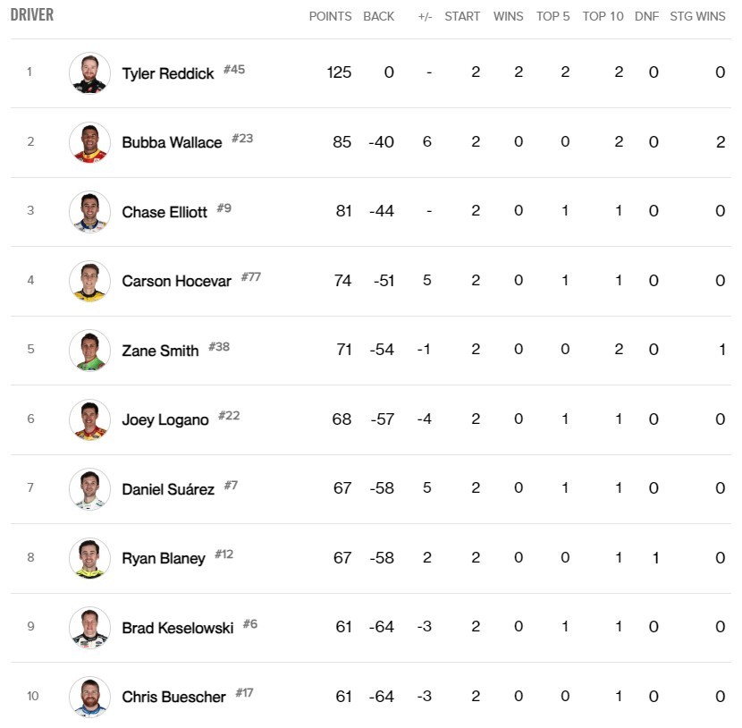 Tras dos batallas, la regularidad empieza a premiar a los supervivientes. Tyler Reddick se escapa en la general con 125 puntos y un colchón de 40 puntos sobre su compañero Bubba Wallace.