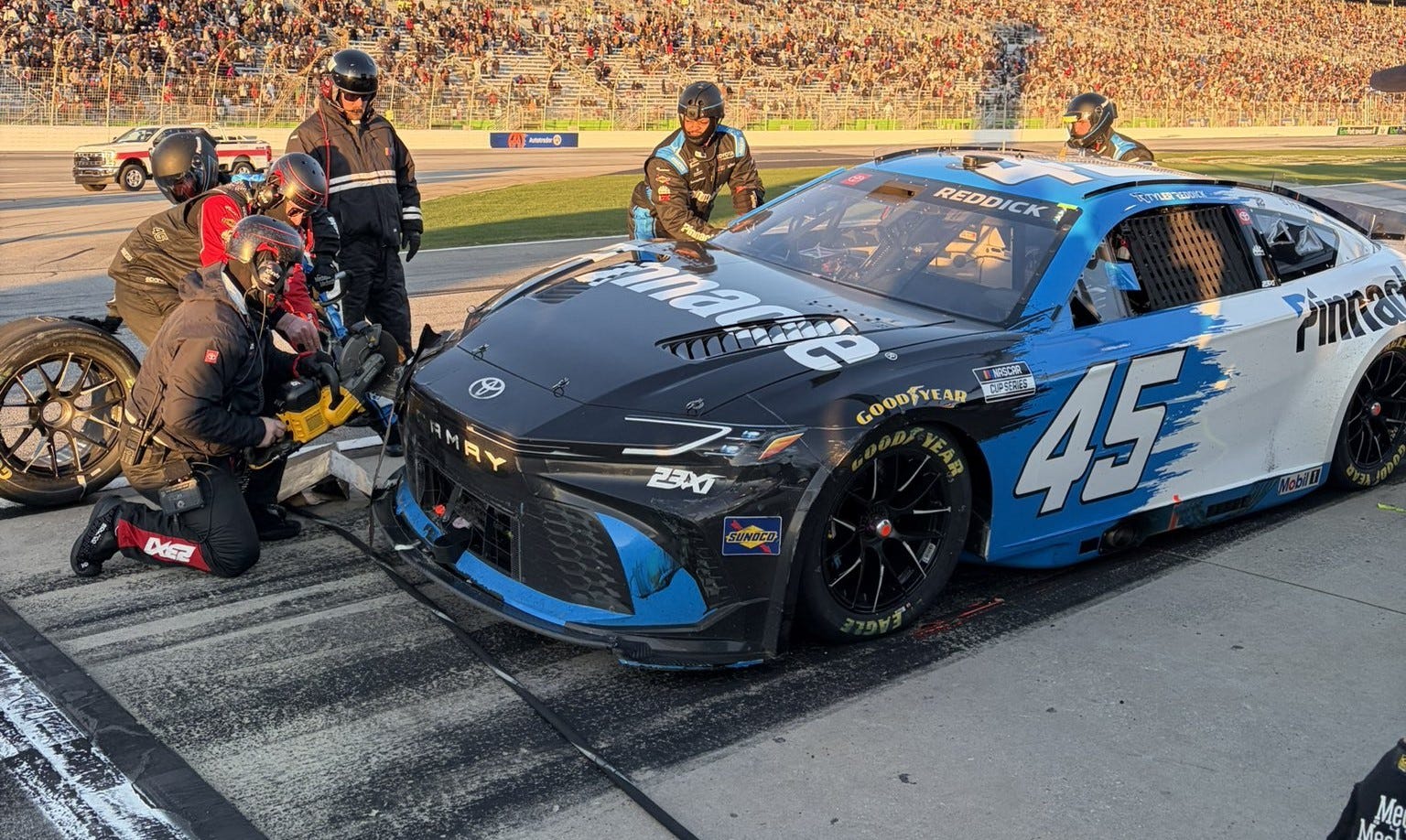 El punto de inflexión de la carrera llegó a solo 40 vueltas del final. Un accidente masivo de 9 coches atrapó a Tyler Reddick (#45), arrancándole el guardabarros delantero derecho. En un circuito de drafting, eso es una sentencia de muerte aerodinámica.